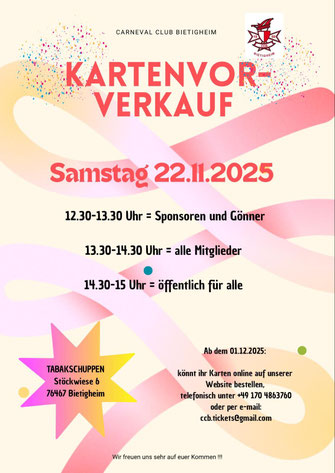 Der Carneval Club Bietigheim, kurz CCB, wurde im Jahr 1988 gegründet und hat unter seinem Dach 16 Untergruppen, die alle an den Prunksitzungen in der Mehrzweckhalle in 76467 Bietigheim / Baden teilnehmen.